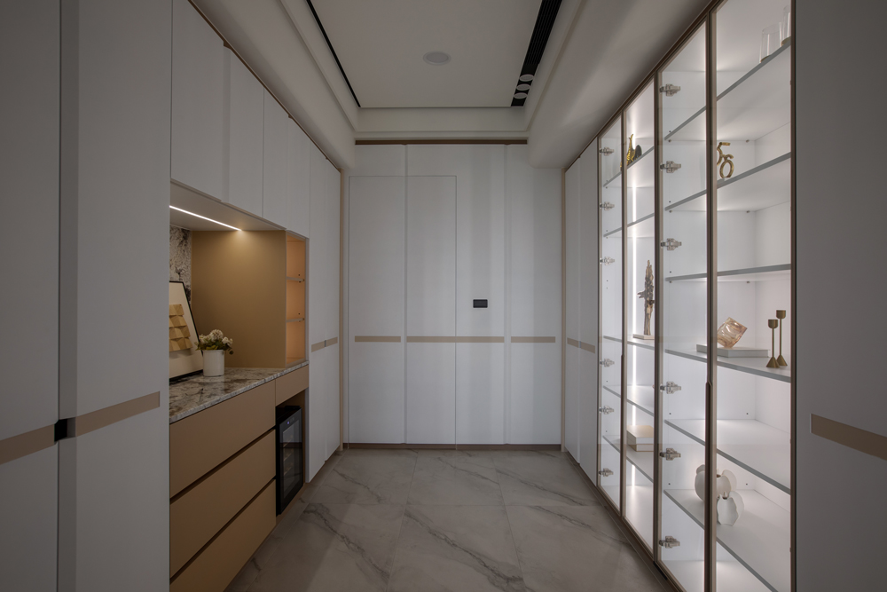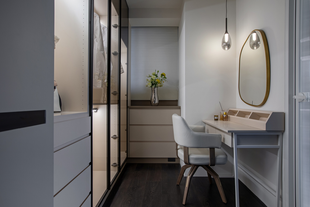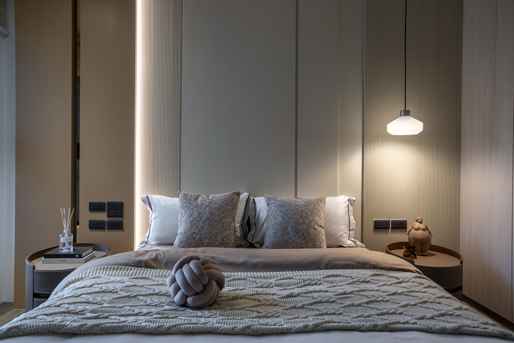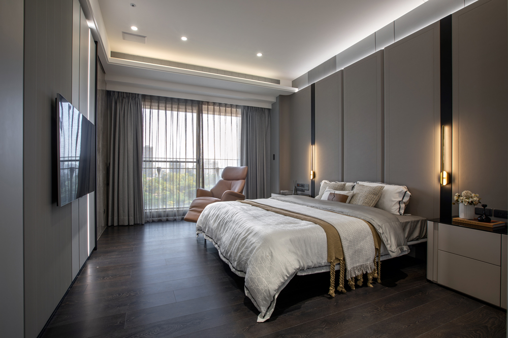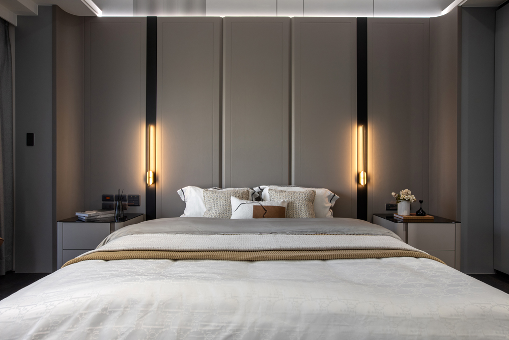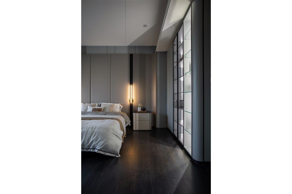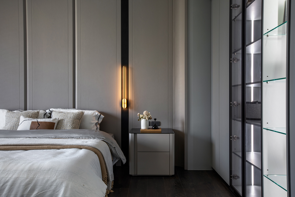 主臥室以深灰與溫潤燈光勾勒靜謐氣質,對稱立面與垂直燈帶,賦予空間莊重的軸心感。專屬更衣間與梳化區,則滿足居住者對生活細節的高標準追求。