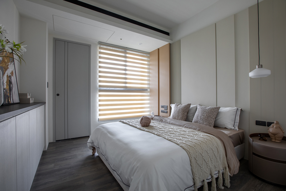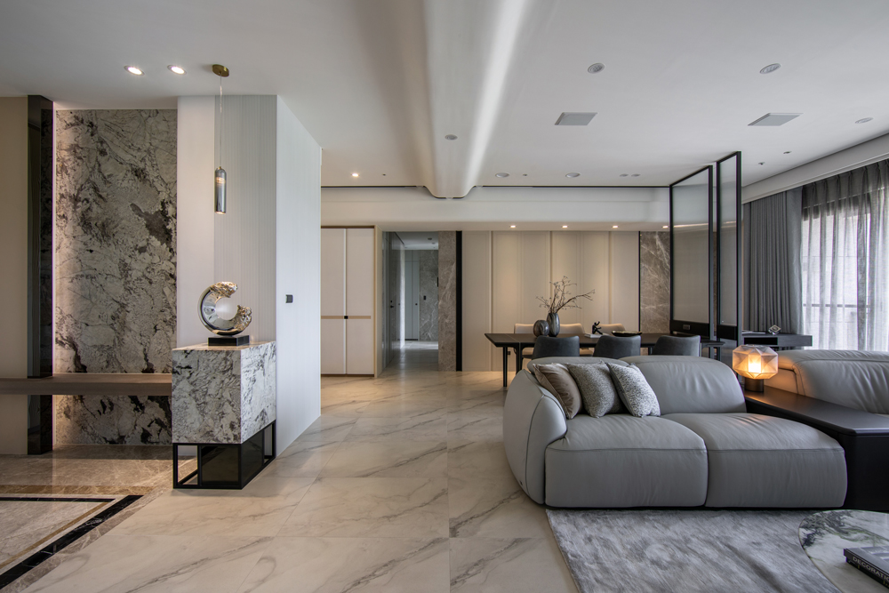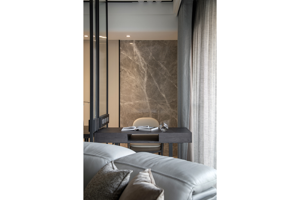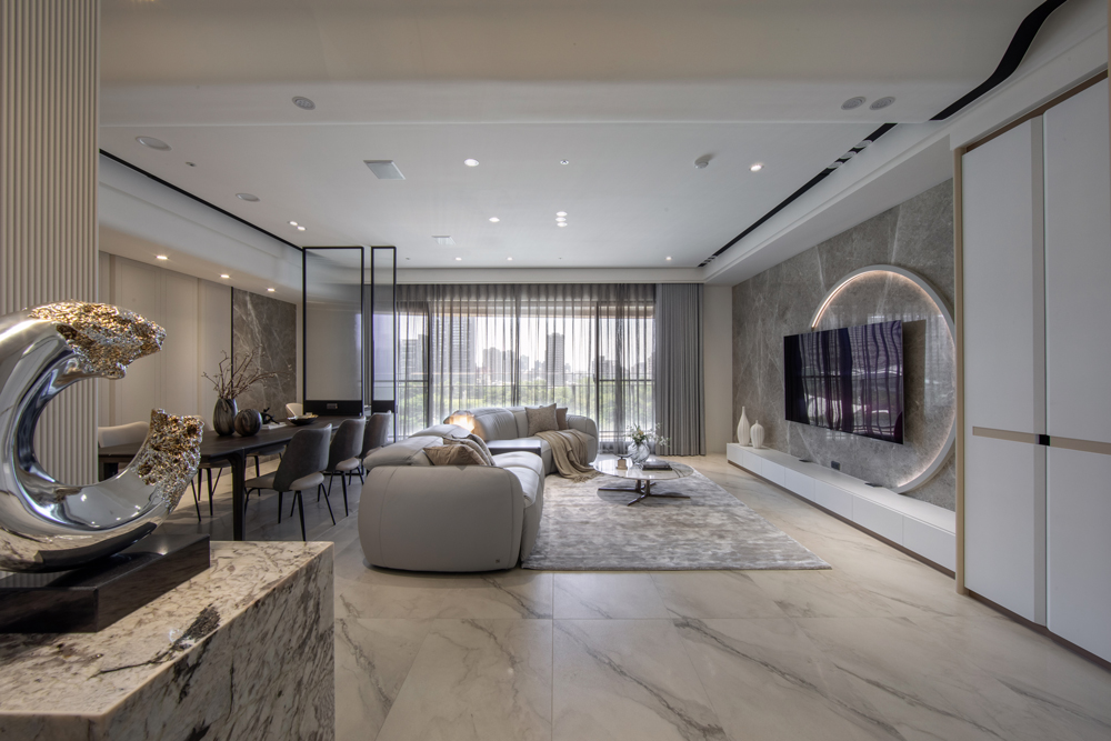低彩度的灰白色調搭配大面積落地窗,將自然光柔和導入室內,既沉穩大器,又散發內斂奢華。