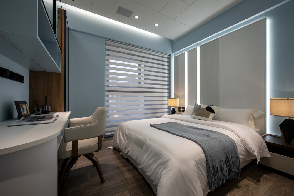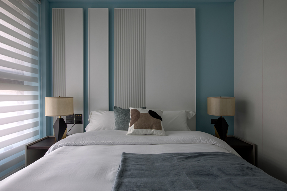 孝親房以柔和色彩與溫潤材質,傳遞安心與陪伴;小孩房則選用清新藍白,融入明亮線條燈光,展現純粹與活力。