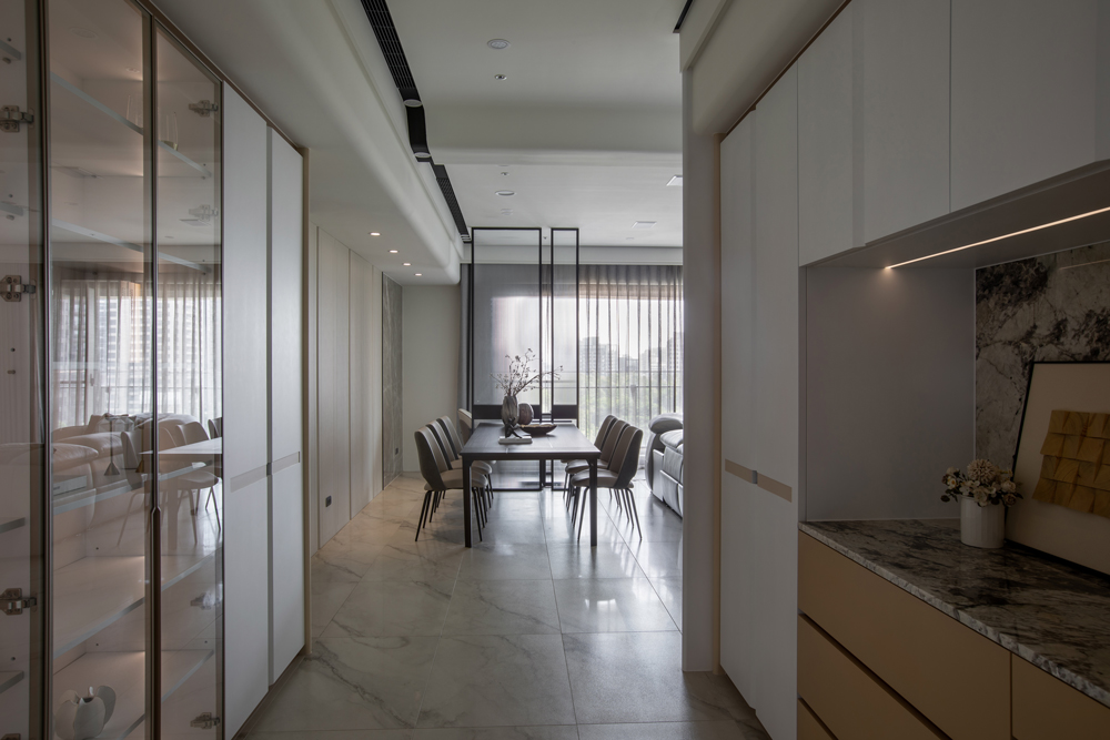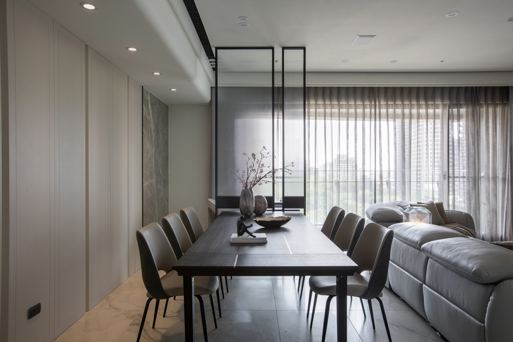 餐廳與客廳一氣呵成,簡約線條搭配精緻器物,營造出宛如藝術館般的氛圍。