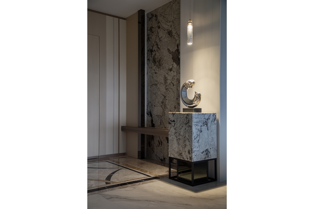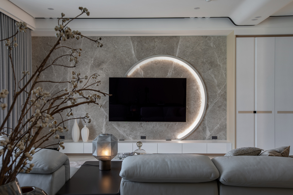 天然石材的紋理與圓弧燈帶相互呼應,形塑出空間的現代美學。