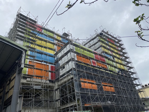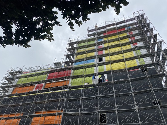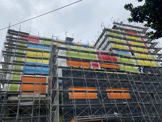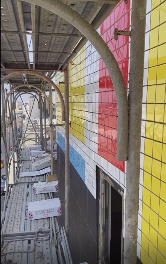 愛這樣設計更新最新施工狀況!!這是一棟工業建築大樓,設計師在建築外牆設計,採用了10x10公分的方塊磁磚進行拼貼,為建築物帶來豐富多樣的視覺效果和藝術感,透過不同的顏色和排列方式,打造出豐富多樣的區塊效果,創造出獨具特色的外觀,從遠處觀察,可以看到整個建築呈現出一種抽象而又有趣的圖案,可從遠處就吸引大家的目光。運用光澤度高的方塊磁磚,反射出陽光和周圍環境的景色,使建築物呈現出多變的色調和紋理,光滑的質感能夠打造現代感十足的外觀的效果。