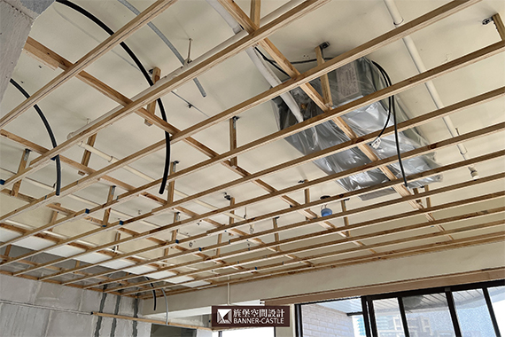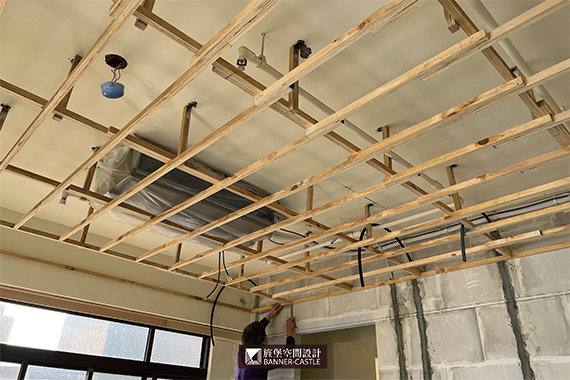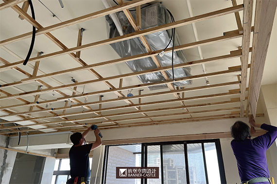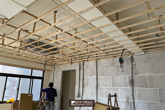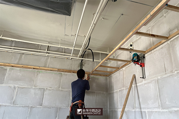 旌堡設計的天花板施工,從以前至今都是堅持以鐵支路工法進行施作,主要是矽酸鈣板也不會有繞曲的現象、更能防止裂板,後續油漆師傅在上漆時,整體會十分平整好上,不會有測光波浪的出現,而骨架的釘法則是採用喜德釘的施作方式,與傳統的整排吊筋不同,吊筋的密度也是1平方米內會打一支吊筋,讓整個天花板結構是一個水平的狀態,不易變形、非常牢固。