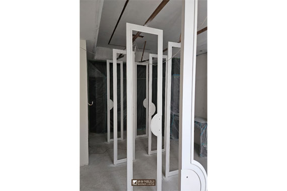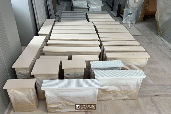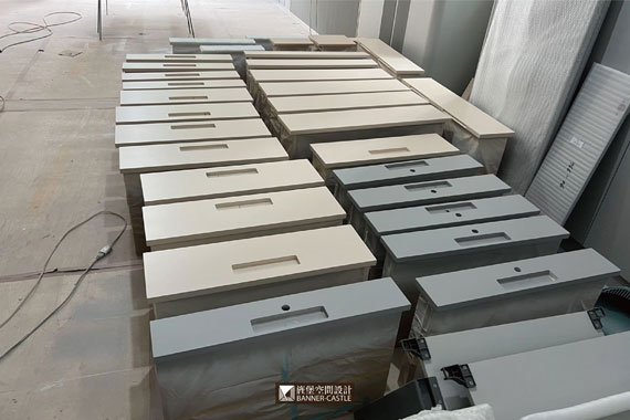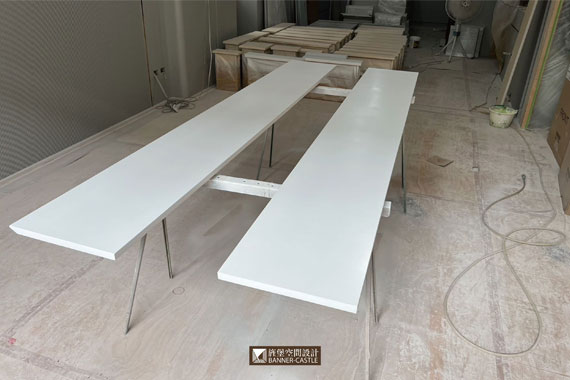 由於此案場的噴漆是升級版-烤漆,使用專用噴槍將漆料以霧狀噴塗到櫃體,由於噴漆是大面積噴塗,所以看上去會比較均勻,平整光滑、觸感細緻,施工速度也比較快速,利用油性的噴漆經過多次程序加工,經過多道噴塗研磨,讓表面變得細緻光滑絲質感,成就空間與物品的奢華大器。