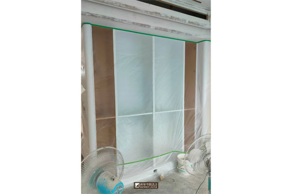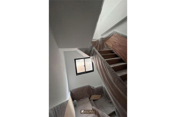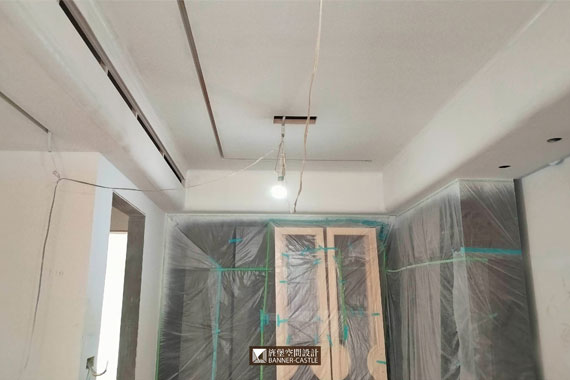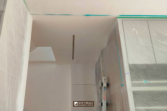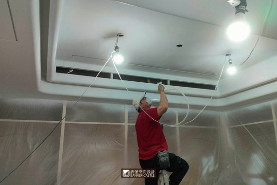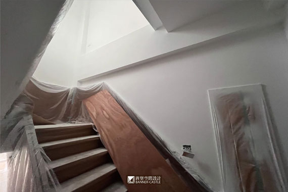 由於此案場有木地板與石材磁磚,所以木地板工程,需等噴漆進行完再進場,以免地板被染到;但石材磁磚就沒辦法了,因泥作工班會先進場,所以進行油漆工程時,師傅就會將地面保護好。