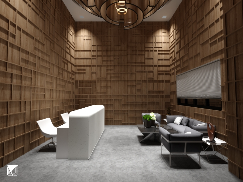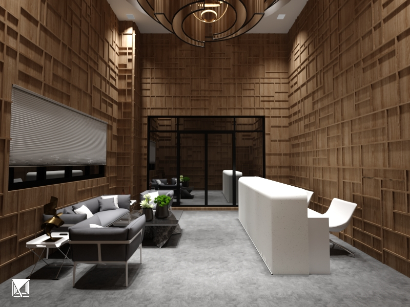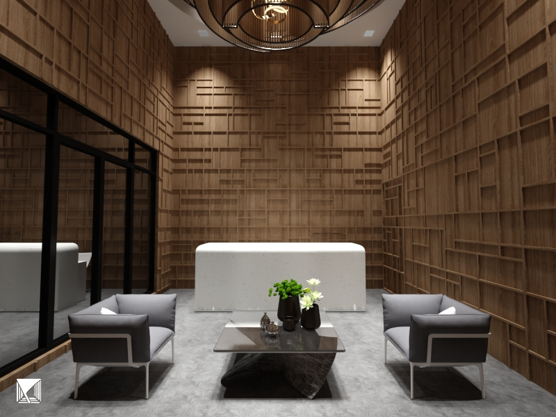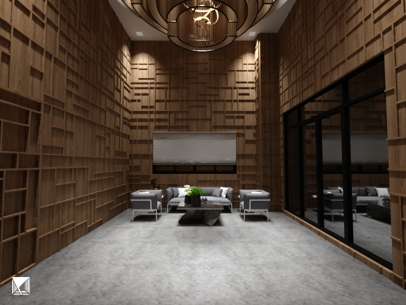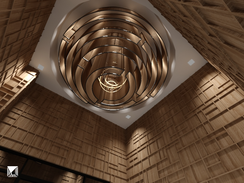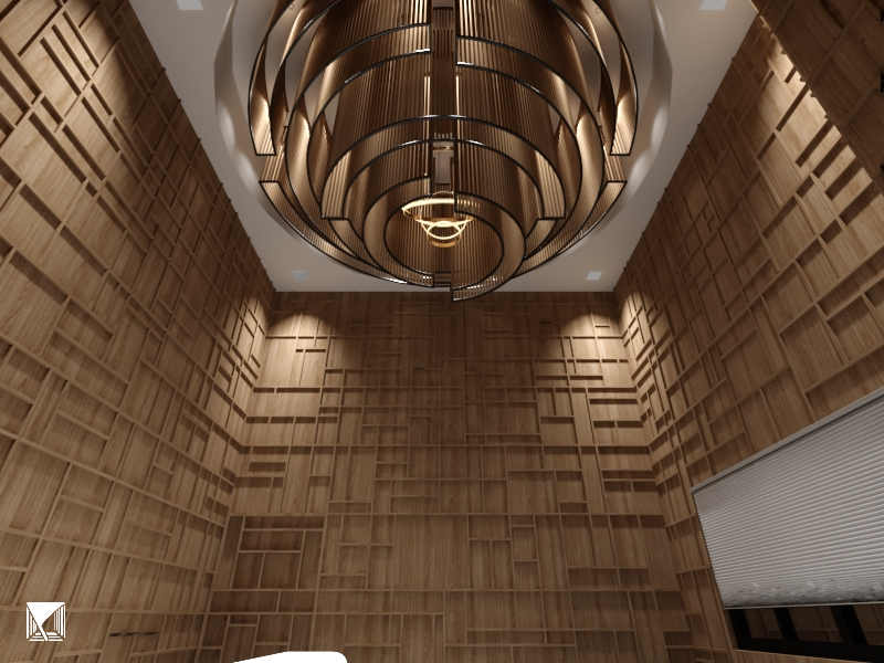 大廳所選用仿木質燈飾,也是用客戶家的木紋鋁板,