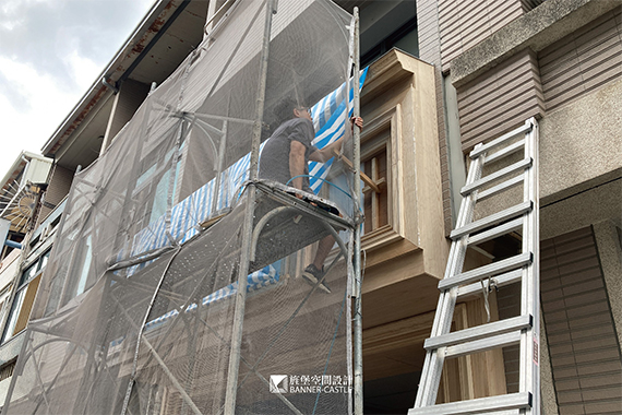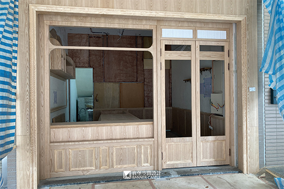 整體外觀營造與門面一致的英式古典風格,線板除了用在室內,也延伸於外觀設計,店面正門與兩側柱體也用木作進行包覆,再用線板調節比例,讓室內外氛圍相呼應,從裡到外都置身英倫街頭。 店門口採用線板沉穩的木質調性,運用線板拉出幾何框線,搭配門窗框線板做細膩的調節,作為整體視覺的延伸,木作的外觀及門面串連整個空間,散發著濃濃的英式古典的氣息,使用大片玻璃窗,引入充沛採光,讓整個室內顯得明亮又舒適。
